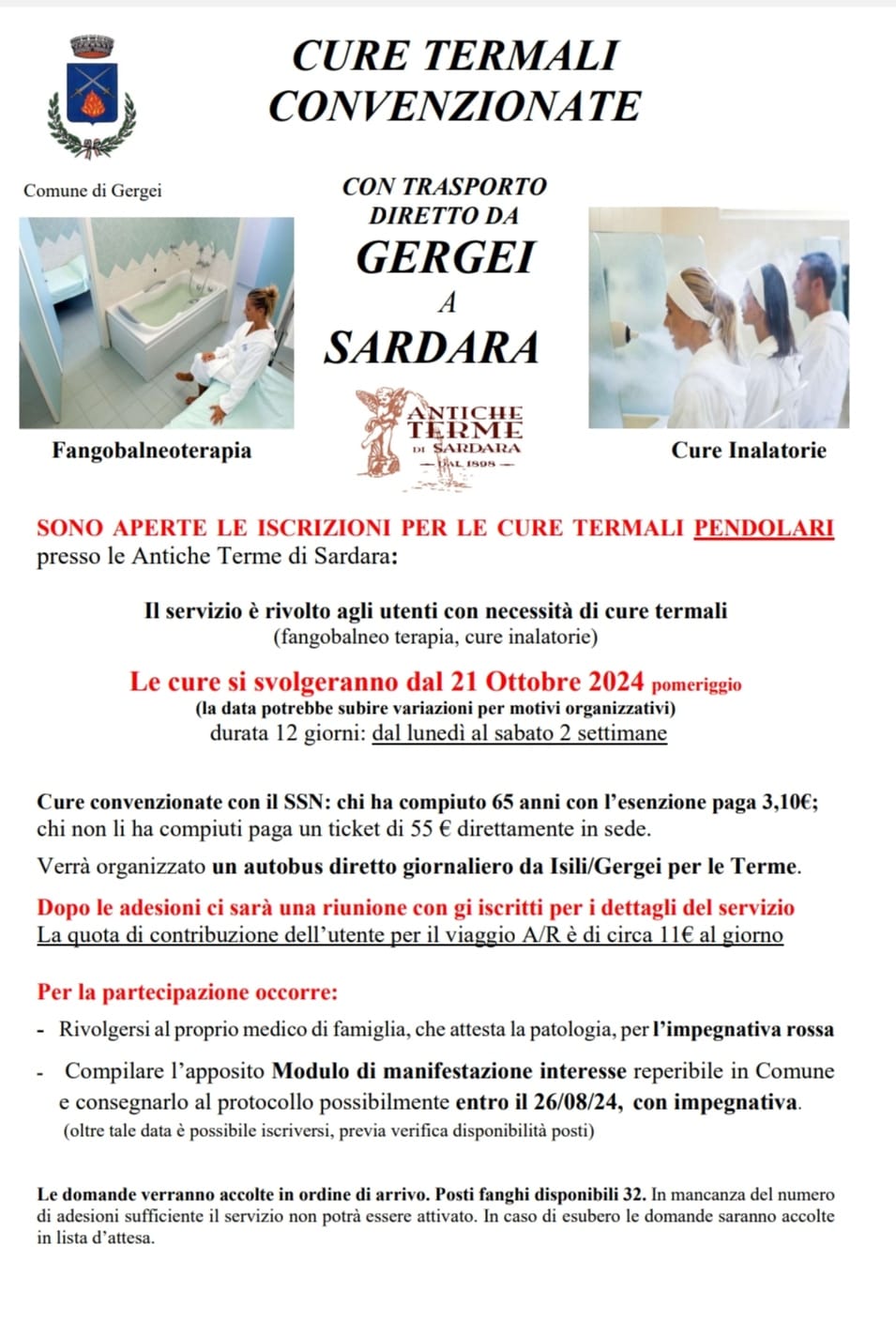 Si rende noto che sono aperte le iscrizioni per le CURE TERMALI PENDOLARI presso le Antiche Terme di Sardara.