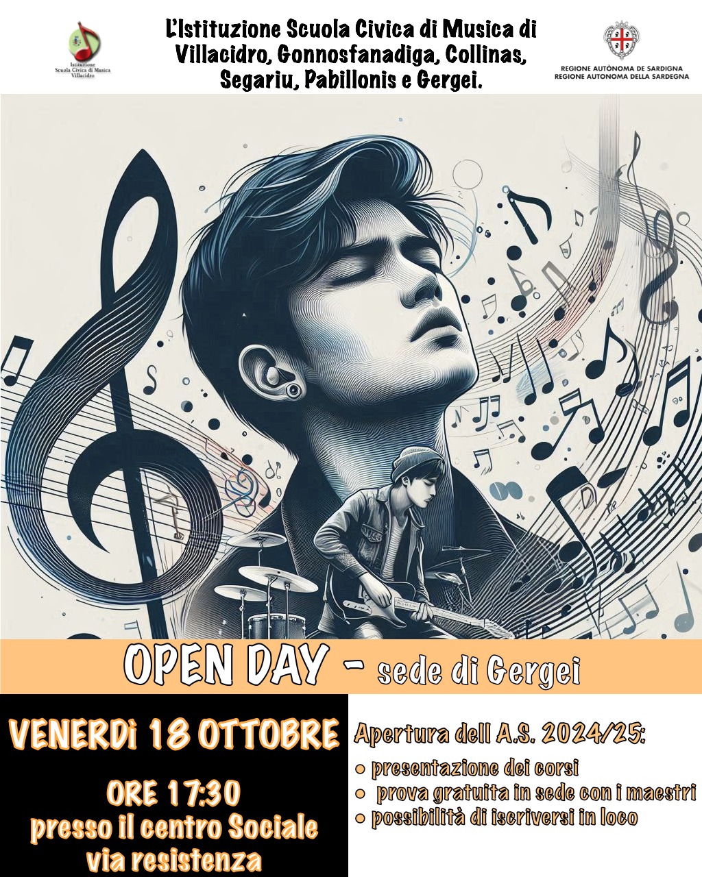 Si informano i cittadini che venerdì 18 Ottobre alle ore 17:30 presso i locali del Centro Sociale si darà luogo all'OPEN DAY della Scuola Civica di Musica.
